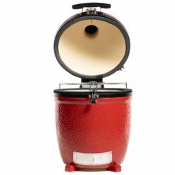 De Kamado Joe Big Joe III is een kamado die het hele jaar door buiten gebruikt kan worden. De rode, eivormige barbecue is verkrijgbaar in diverse maten en met veel mogelijke accessoires. De warmte in de barbecue wordt goed vastgehouden en verdeeld dankzij de keramische wanden en de unieke vorm van de kamado. De temperatuur kan eenvoudig ingesteld worden op een temperatuur tussen 82°C en 399°C. De buitenzijde van de barbecue blijft relatief koel, externe temperaturen hebben geen invloed op de temperatuur binnen in de Kamado Joe. De temperatuur is eenvoudig af te lezen om de ingebouwde thermometer in de koepel. De pakking van glasvezelgaas, die wel tien keer zo lang meegaat als de gewone, industriële pakkingen, zorgt dat er nog minder warmte verloren gaat. Dankzij de gepatenteerde, regenbestendige Kontrol Tower Top Vent, kunt u de luchttoevoer en daarmee de temperatuur nauwkeurig instellen. Met de meegeleverde, gepatenteerde Hyperbolic Insert, die u onder de barbecue plaatst, zorgt u voor een nog betere warmtecirculatie in de barbecue.